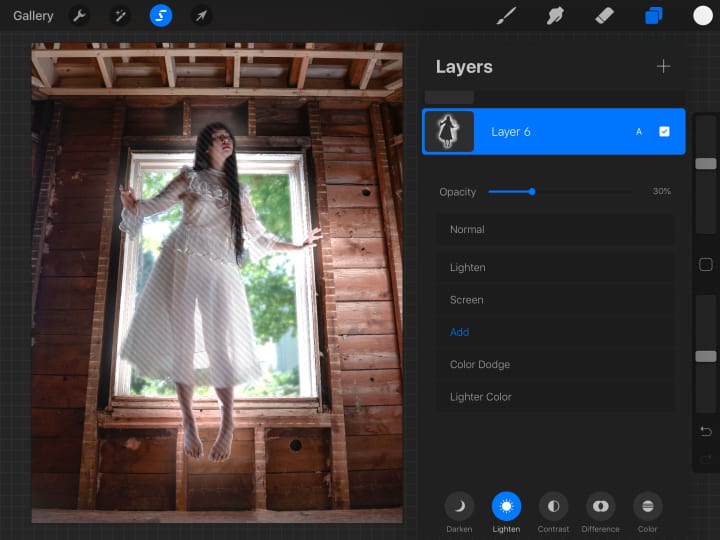 As you can see in the above image, I have the opacity turned down to 30%. I went a bit overboard with the glowing brush and decided to make it more subtle by reducing the opacity. That’s the benefit of working with layers! I chose the blend mode “add” (Linear Dodge in Photoshop), because it actually brightens the colors underneath it without losing saturation.