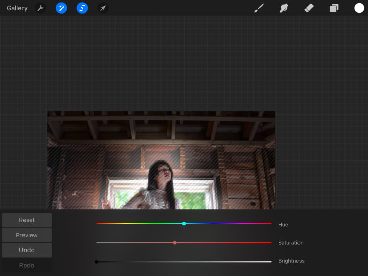 Let’s look at the photo and think about what I want. I want the model to be the primary focus of this image. She’s already glowing and floating, but there are some things in the background that are too distracting. For example, the ceiling! The ceiling is too bright. Also, the right side of the wall is much shinier than the left side. I don’t like it! But that’s okay, I have the power of Photoshop/Procreate and with a wave of my wand I can make the image bend to my whims!