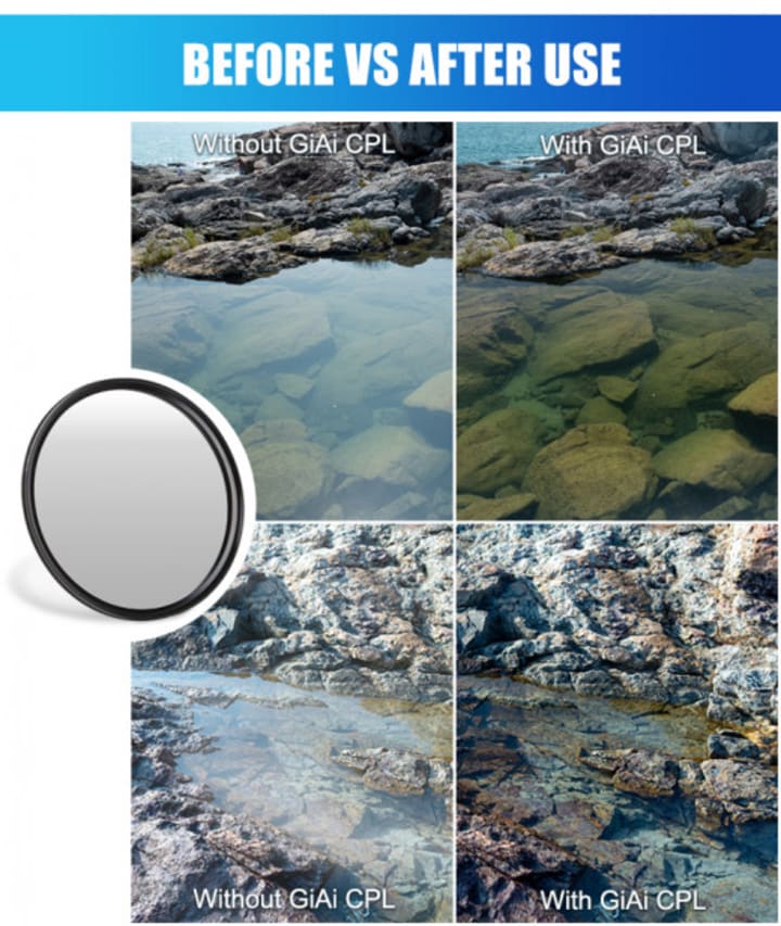 CPL filter is used to eliminate the reflection of non-metallic objects. Notice how the water becomes clear on the photos when you use CPL filter.