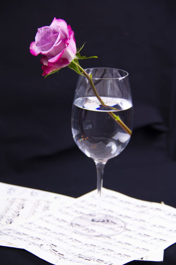 There's something captivating about a rose in a wine glass sitting on a scatter of music sheets. I have this fantasy that Mozart composing his pieces musical pieces with the sweet fragrant roses and wine beside him where a contrast between loveliness and dramatic passion unfolds. It's as if balance between light and dark creates symphony of passionate romance that is reflected in his emotional music.