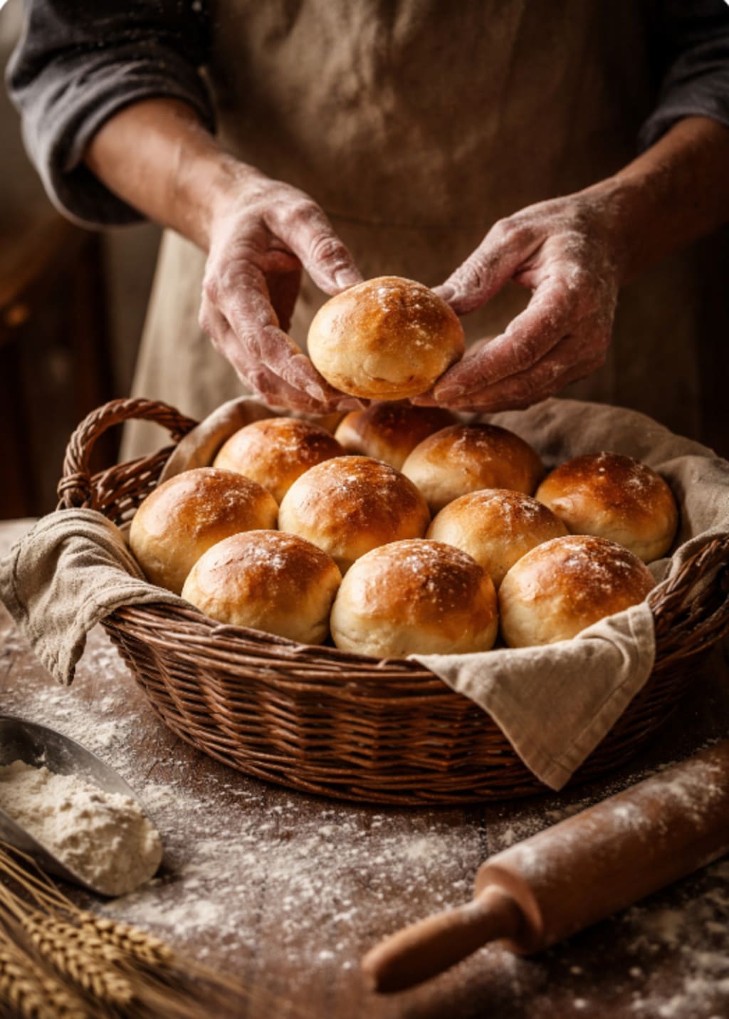 The baker counts with tired, flour-stained fingers,