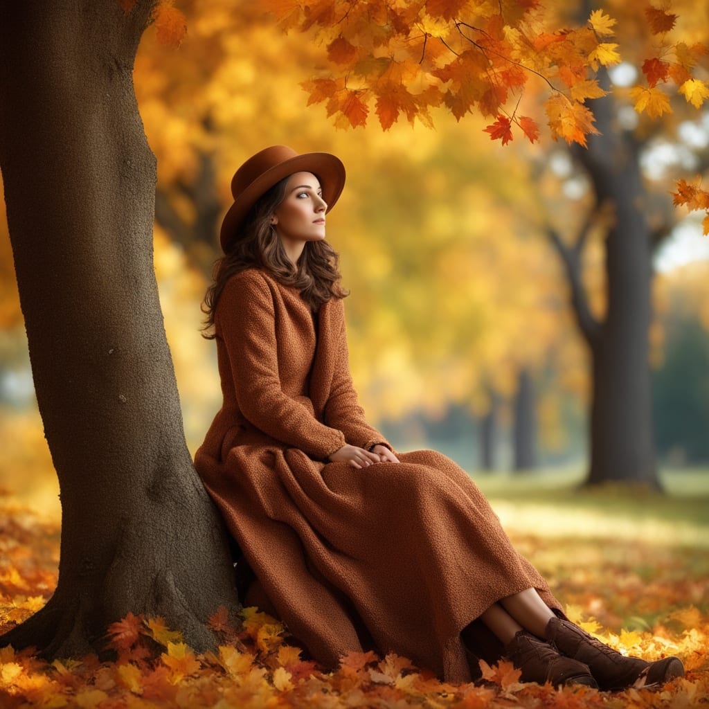 Under a grand tree, a young lady sat. Dressed all warm, she was, ready for a grand adventure of a sunny day. All around, leaves cascaded, a colorful storm of autumn joy. Her thoughts wandered, as she daydreamed about a journey to the stars.