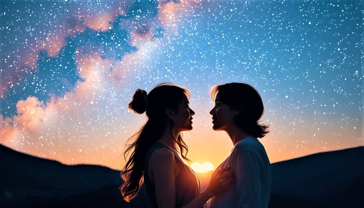 Souls soar and embrace among the stars,
