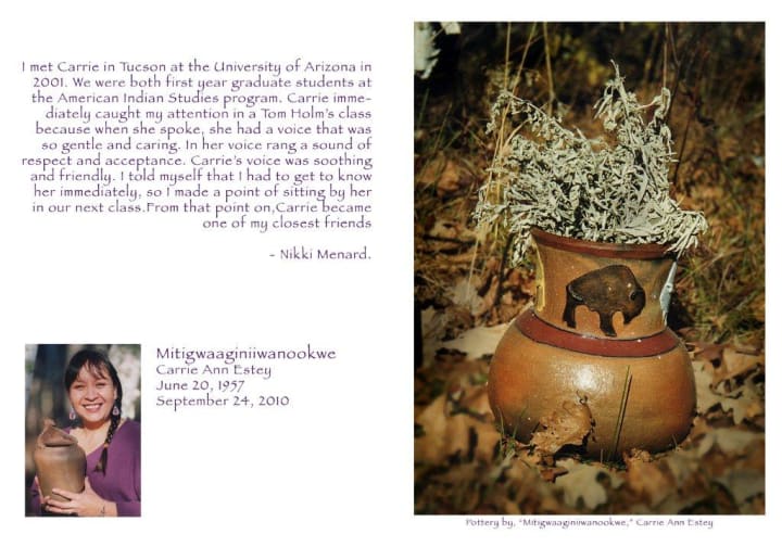 Carrie completed her four-year degree at Bemidji State University, and she graduated with honors, before attending college in Arizona for a Master's degree in American Indian studies and Museum curation. It is an honor to be asked to be a part of the exhibit, but it will be additional work for me.