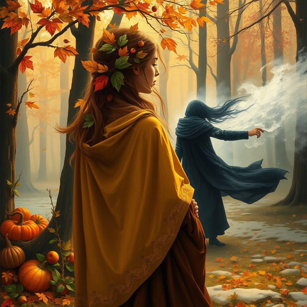 In her delicate grace and beauty, kind autumn fairy Russet-Red tried to stave off the wicked witch Winter-Dark's bringing of first frost.