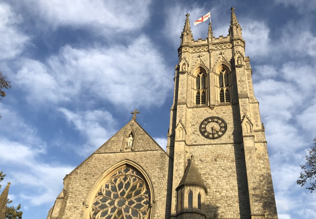 Tall tower with flag of St George to see.