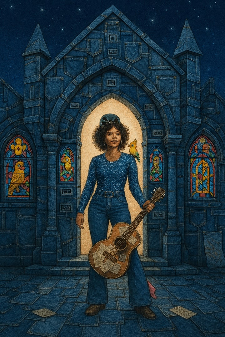 Sweetie Bird flutters to the windowsill, silhouetted against a neon sign that reads “Stay if you dare.” She pecks at a stack of postcards each one an image she’s chosen for today’s ritual.