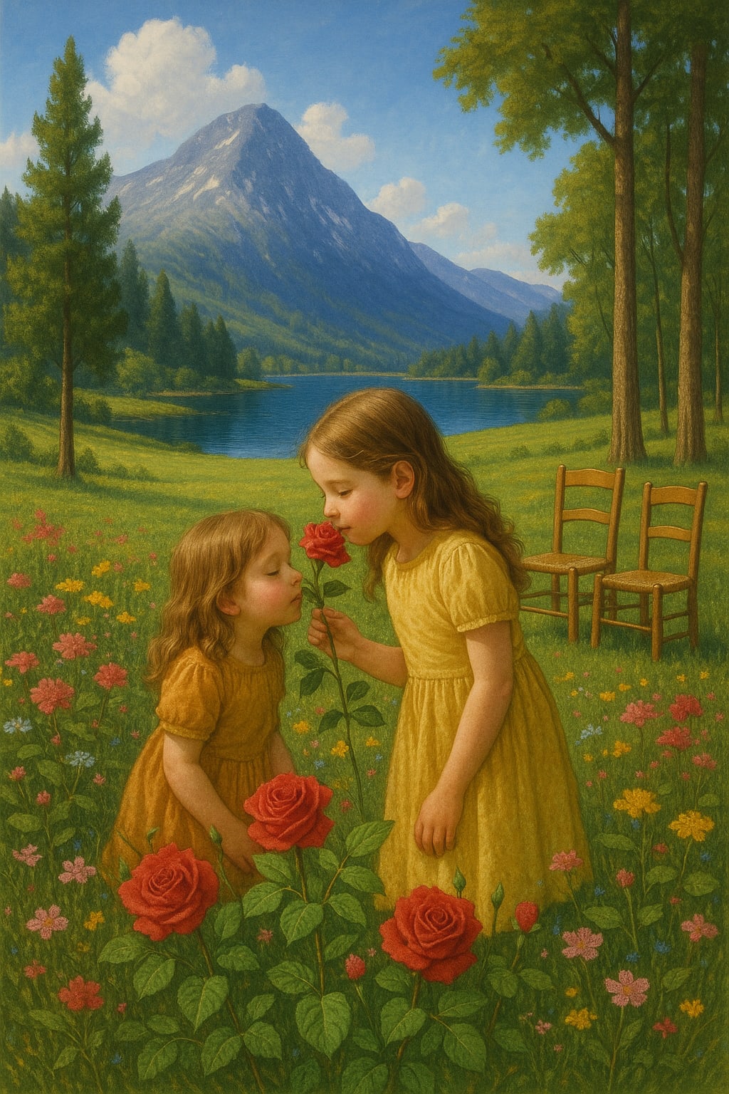 In a serene mountain valley, children explore nature’s beauty—smelling roses, laughing in lush fields, beneath tall trees, by a quiet lake, under a sky painted with peace.