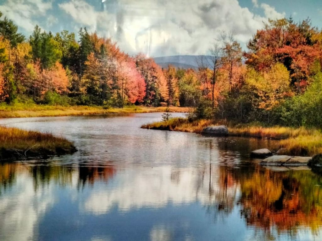 A poster on the wall is the first thing I see, a calm rambling creek that goes through a forest of trees.