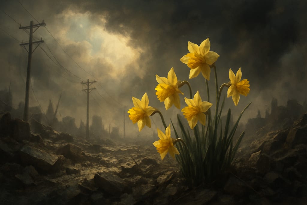 Beautiful poem & image… I love daffodils. Lovely lines: “No springtime choir sang. Still, golden heads rose, leaning towards the shadowed light,”