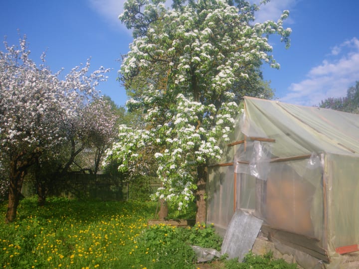 In the spring the garden turned into a fantasy with blooming apple trees, and a pear bursting force in pink and white blossoms. For a short time it was a lovely sight to behold and as the spring breezes softly blew, the white blossoms began dancing upon the wind, making it seem like scented snow flaked in the springtime.