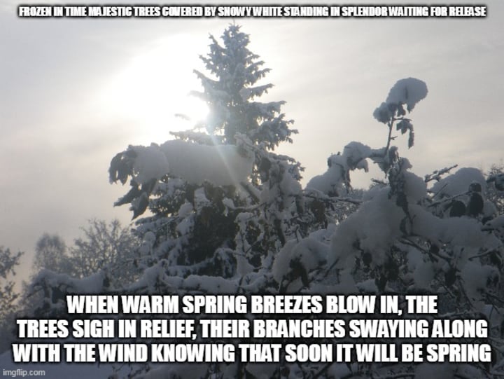 In the winter now a frozen world to face, our footsteps leading through the white snow. Into the quiet of the woods where firs and pines added color to the gray landscape and their lovely dark green needles looking beautiful covered with pristine white snow. When the snow started to melt in silvery white rivulets, the breezes became milder, and it all heralded the arrival of the long-awaited spring.