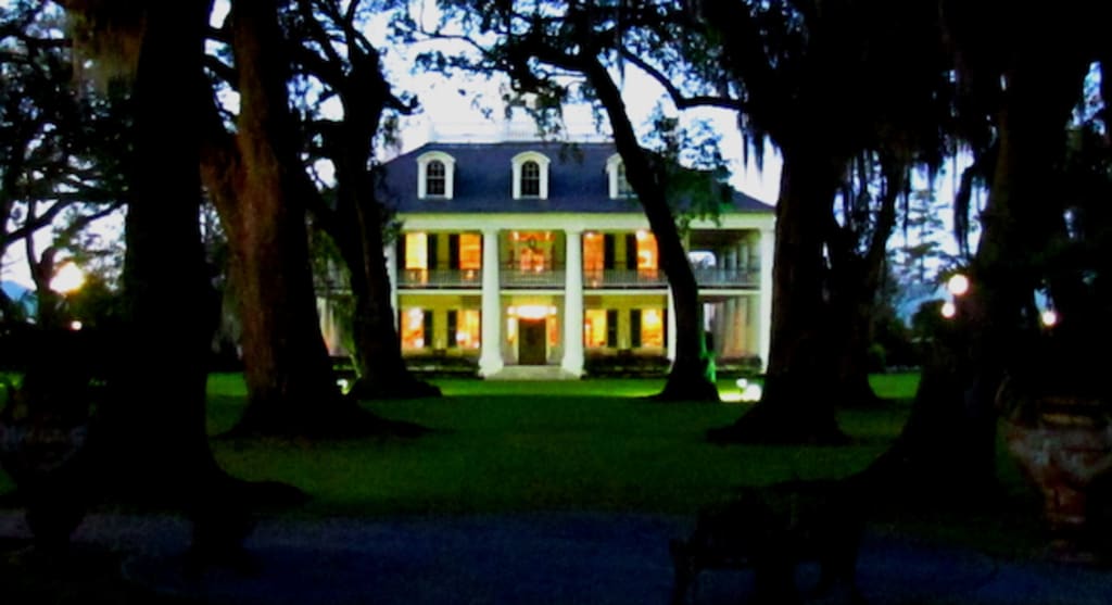 It seemed I was in another world, the real one now so far away. As the Spanish moss did sway, I thought I heard some music playing. It was the sad plaintive melody of a gypsy violin. Then there ahead of me I saw the end of the path and it appeared to me, that I was about to step right up to that glowing moon. When out of the shadows I came, I was upon a grassy riverbank. Upon a hill stood an old plantation house its windows sightlessly looking out at me.
