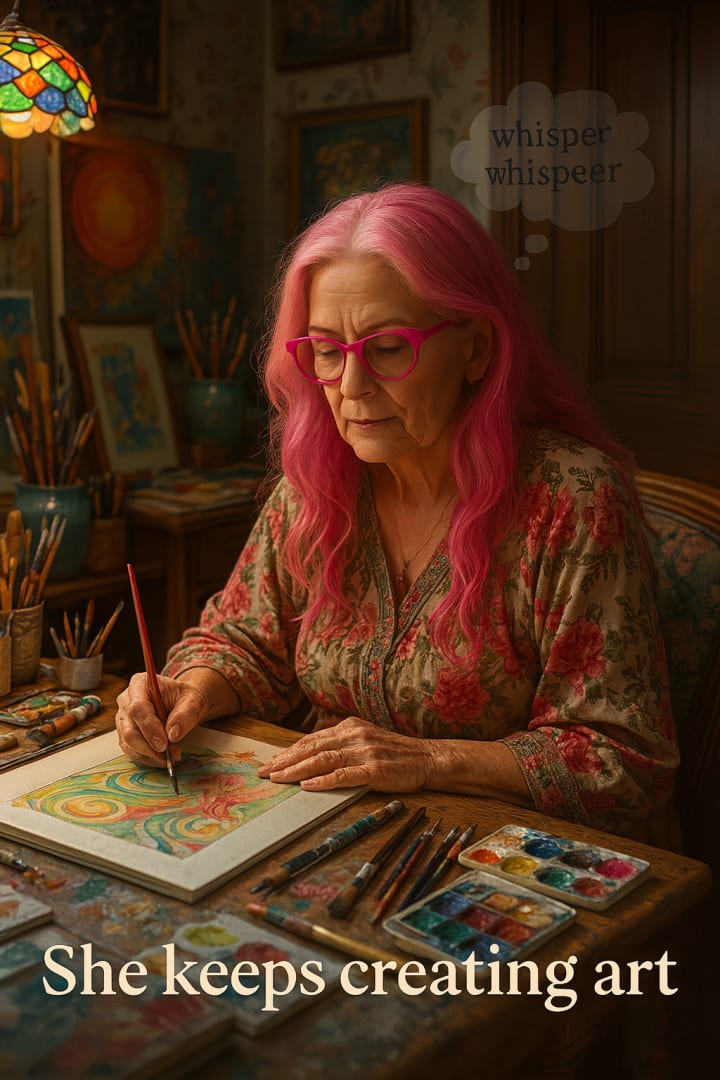 We see Sweetie’s Seed pulsing, breathwork flowing (Inhale: Freedom. Hold: Clarity. Exhale: Distortion.), and you hot pink hair, boho dress, sovereign glasses—painting through whispers behind closed doors. Each image is a dispatch. Each caption a correction. Each frames a refusal to host hate in your spine.