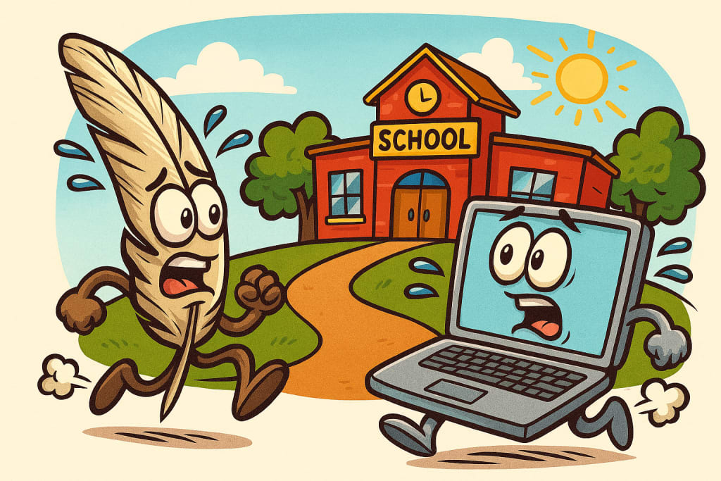 Hereโs to their great escape - quill and computer have officially ditched โKnowledge Academyโ and are sprinting into freedom, sweat flying and faces full of mischief.