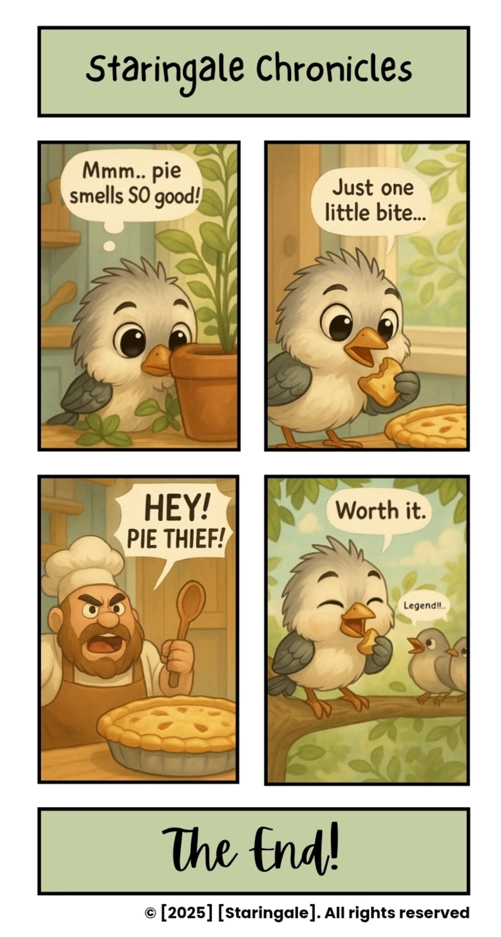Just then, the baker appears, waving a spoon and yelling, “Hey! Pie thief!” The little bird darts toward a tree, a bite of pie still clutched in its beak. From my seat, I watch it savor the last morsel, as if declaring, Totally worth it. The other sparrows stare in awe, as though thinking, Legend.