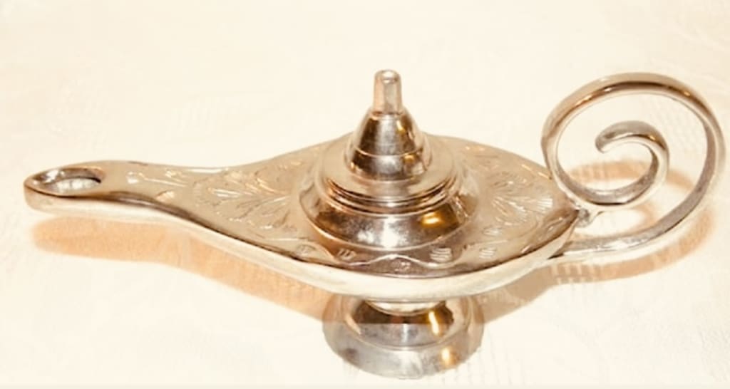 A genie emerged from the lamp, wafting ethereal
