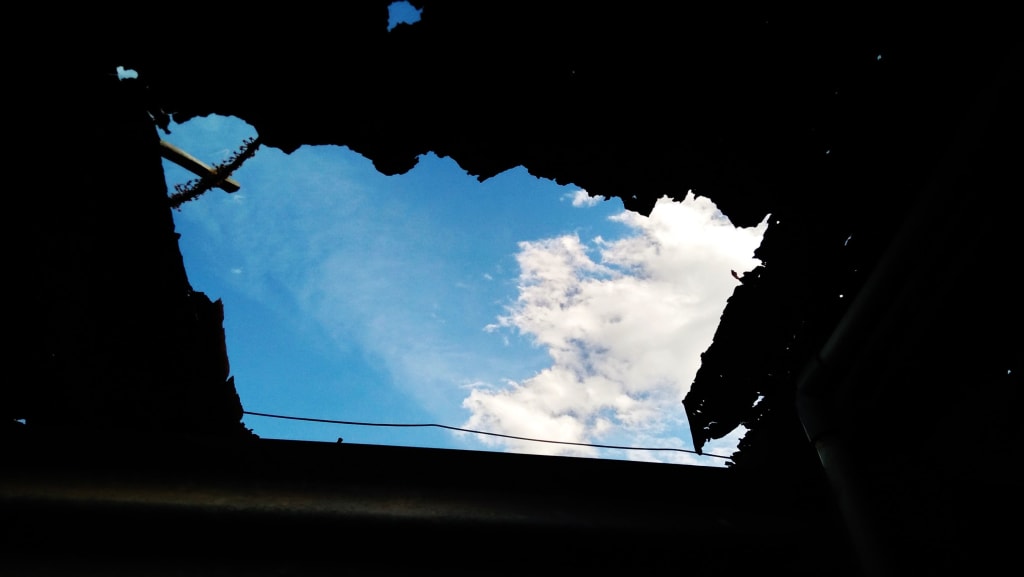 The sun taunts through the punctured garage roof,