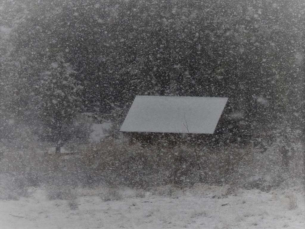 There was a rickety old table, stove, old bed, sittin on the dirt floor,