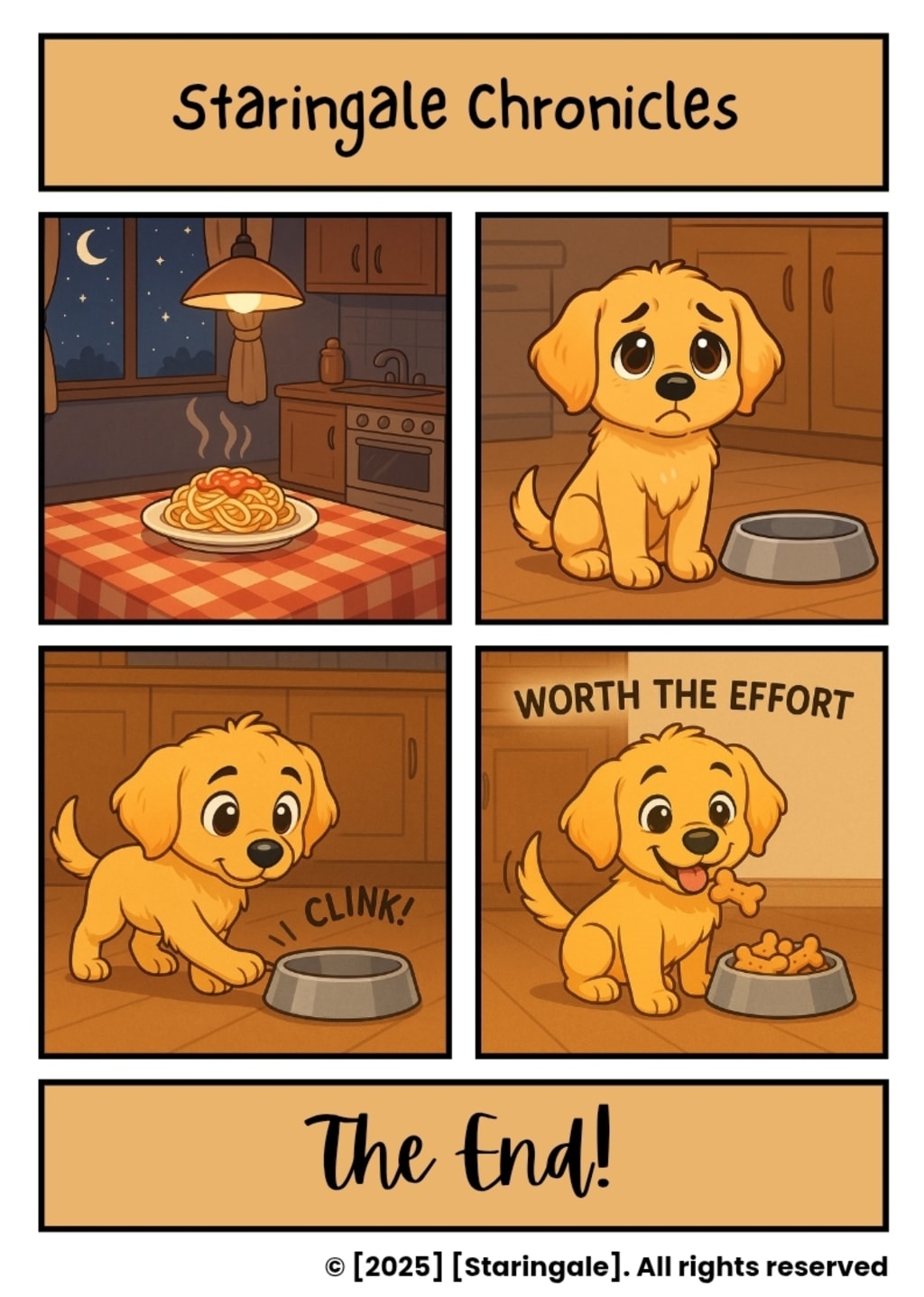 As I cleaned up and sat down to take my first bite, a whimpering sound caught my attention. I turned toward the noise and was met with an adorable sight—my nephew’s puppy dragging his dog bowl toward me. He placed it at my feet and stared up with those irresistible puppy eyes.