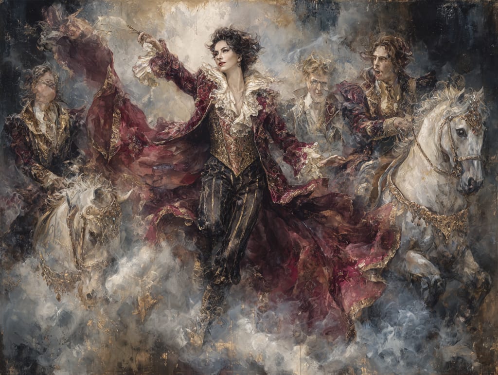 all whirl and whisper, pressed velvet shoulders brushing dust from chandeliered rooms,