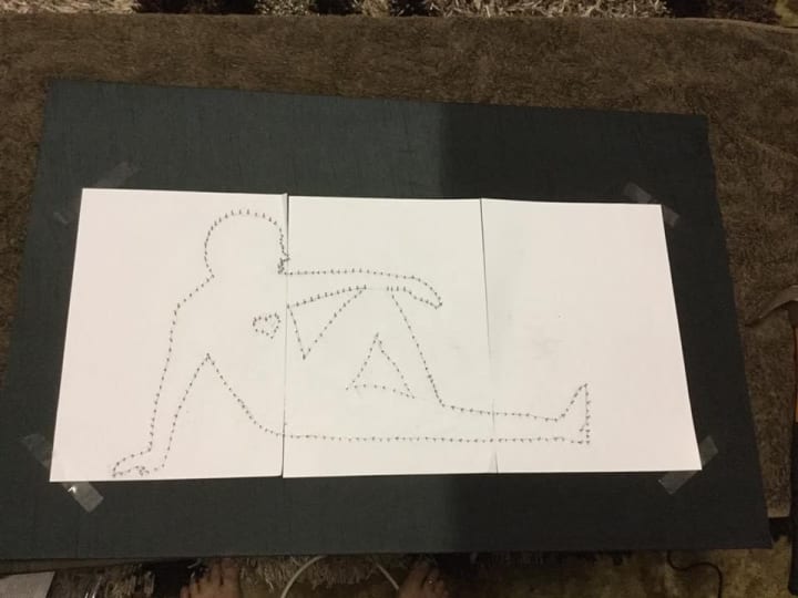 Lay over my son’s drawing and tack the outline.