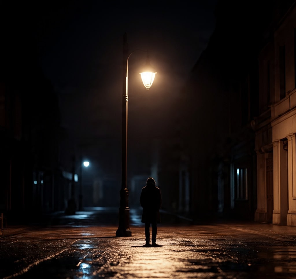 Footsteps fade on empty streets,