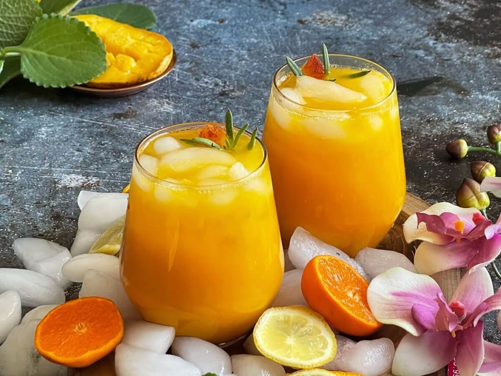 A glass, of orange fizz, is a perfect, happy bend.
