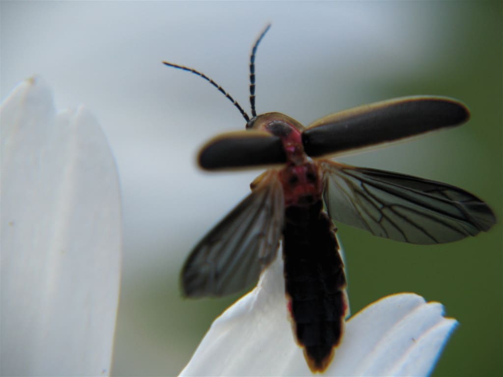 Hundreds of Photinus pyralis hover nearby on this midsummer night, their bioluminescent undersides signaling to unseen, un-winged females. Now there is one less competitor.