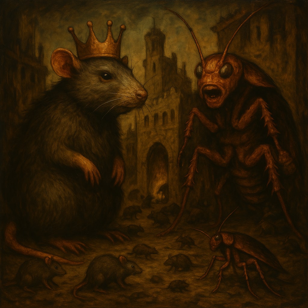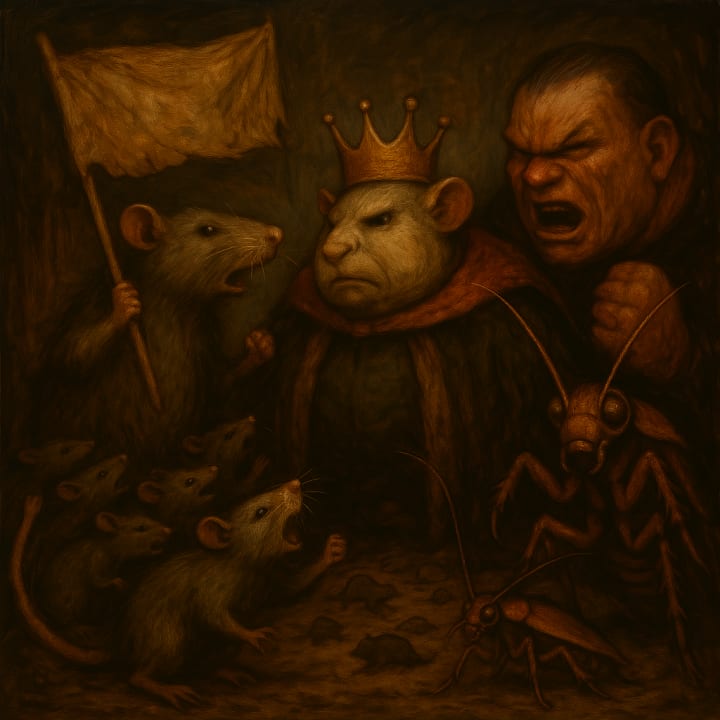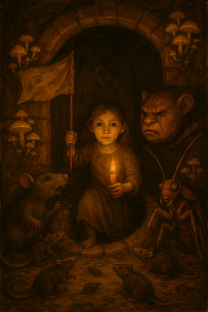 In the shadows, an uprising simmered - not loud, not violent. Just clever. The rats translated forgotten blueprints. The roaches delivered messages sealed in breadcrumbs. And deep below, a child...neither rat nor roach, neither bully nor king...drew maps in dust. Her lantern flickering with purpose.