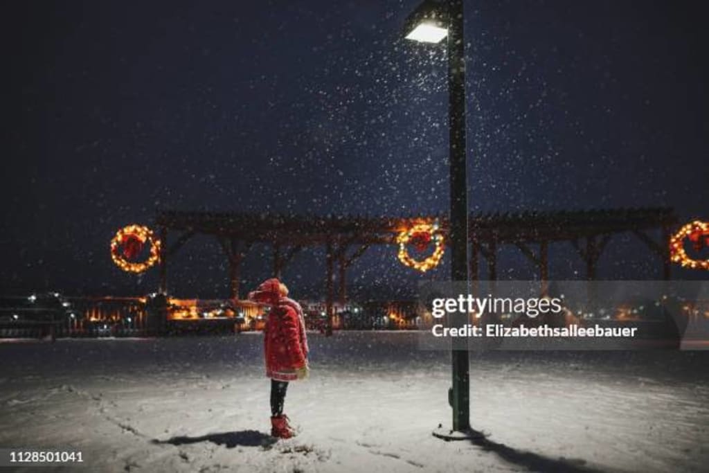 As the snow falls on upturned face