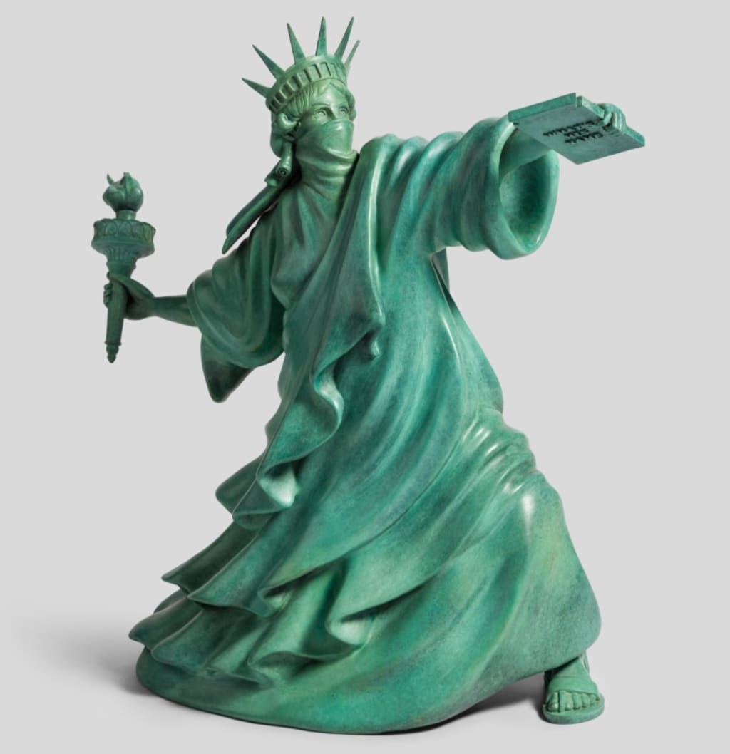 That sculpture sounds really interesting. I like how it ties into the idea of liberty. And those song references are cool too. I wonder how the sculpture and the songs connect on a deeper level. Do you think they all share a common theme that's especially relevant today? Also, what do you think the "Book She Holds Asks 'What's His Name?'" really means?
