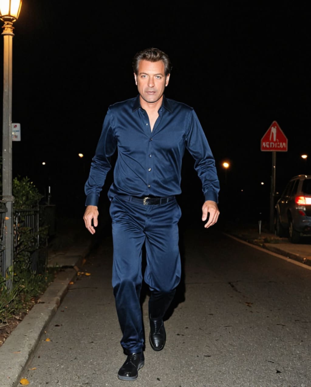 His shadow stretched past streetlights,