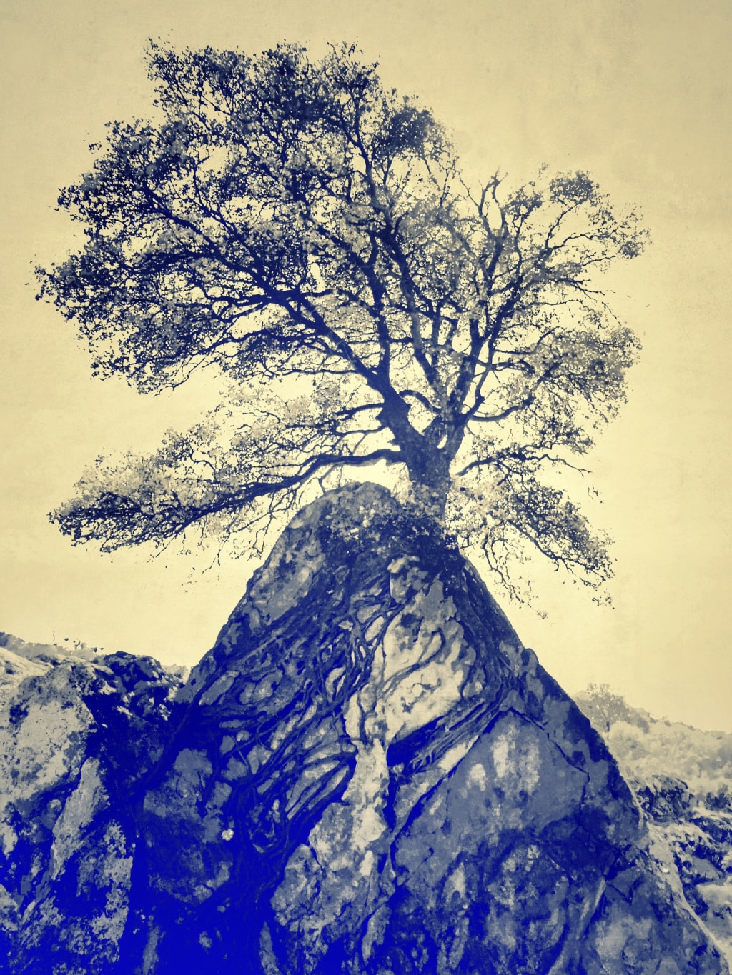 A tree stands alone, wrapped around a rock, reaching every which way in order to survive. The result, the strongest tree in the world.