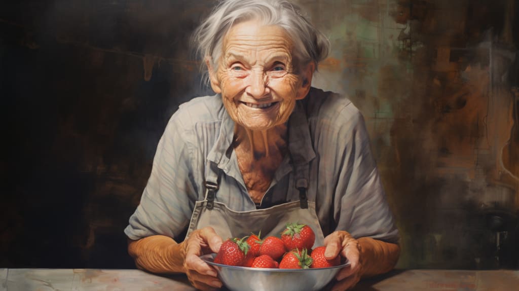 Ripe strawberries and peas from her garden, she will pick to share with us, which she grew.
