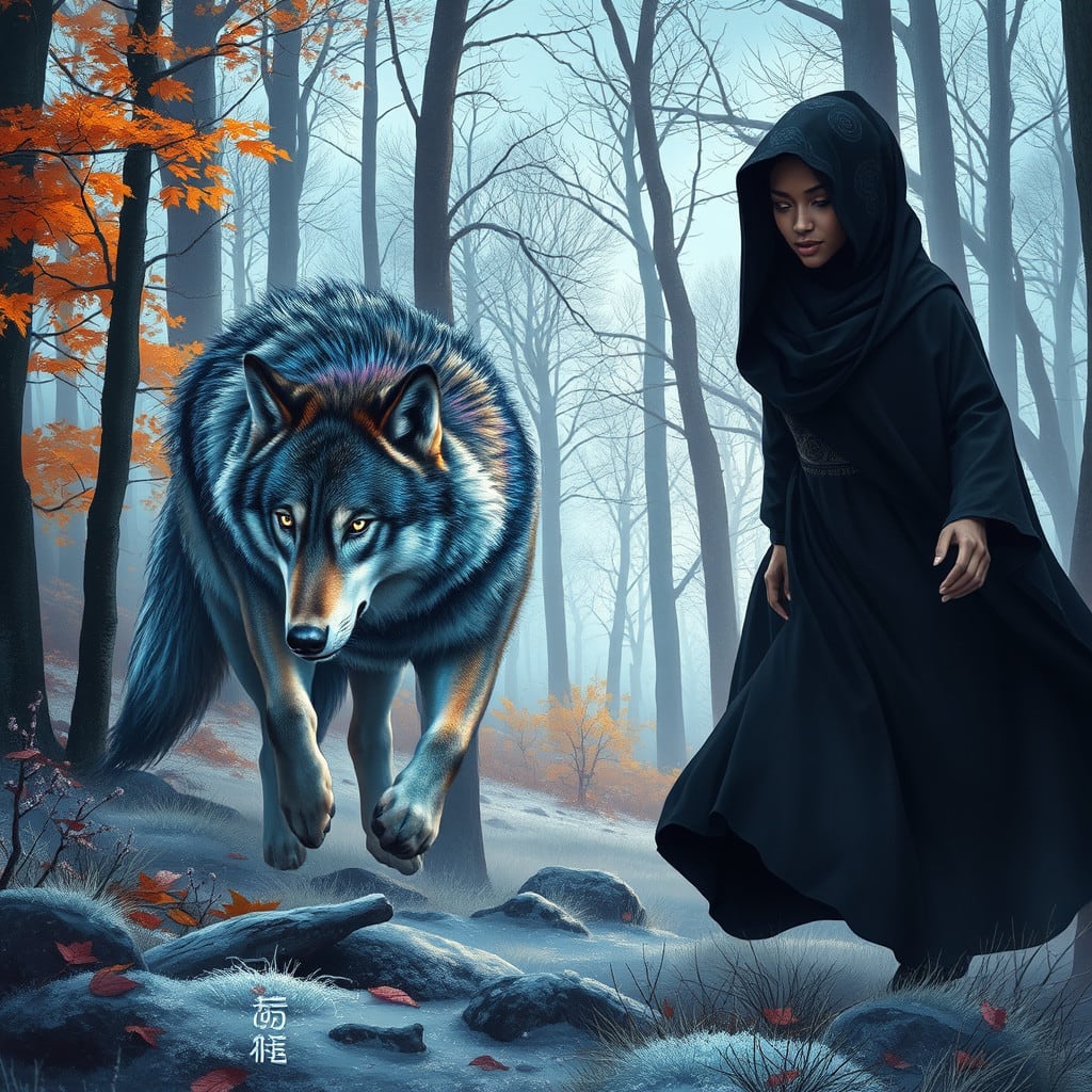 Sheba, sensing the magic, raised her head and let out a melodious howl that echoed through the valley. Her breath, visible in the cold air, mingled with Mayana's frost, creating a dance of light and ice.