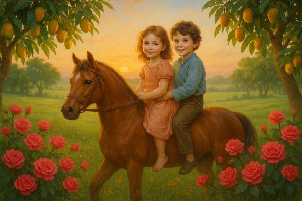 At sunrise, two joyful children ride a chestnut horse through lush green fields, surrounded by blooming roses and mango trees, under a pastel sky glowing with golden light.