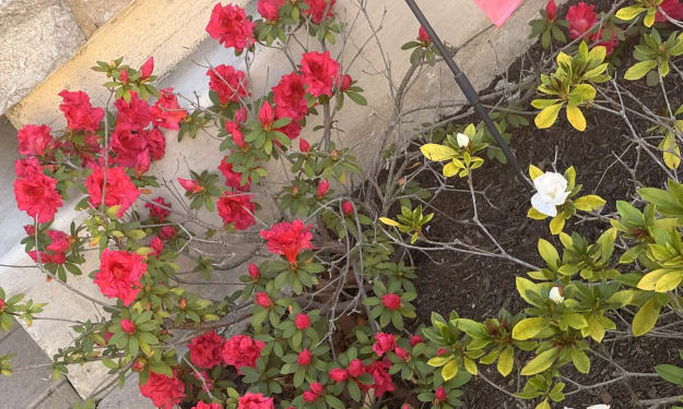 azalea pink, white attracts attention on walks, a feast for the eyes. Note: Just like camellia, this time of the year, azalea bloom in the neighborhood yards, looking beautiful. They are also called rhododendron I have heard a variety of rhododendron bloom in the foothills of Himalayas, creating a beautiful vista.