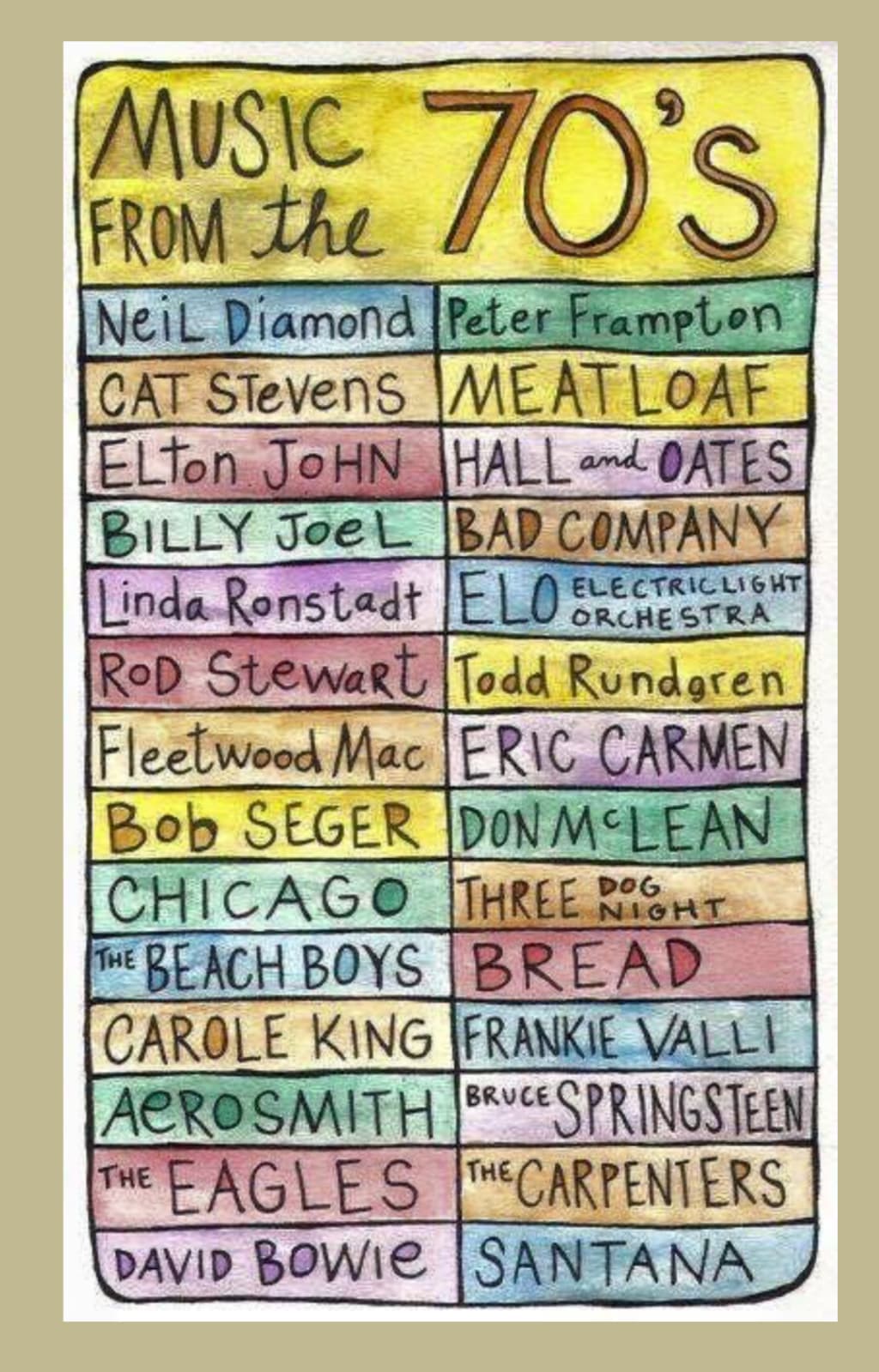 Great work and I remembered most of the groups in the image for a was a young child of the '70's.