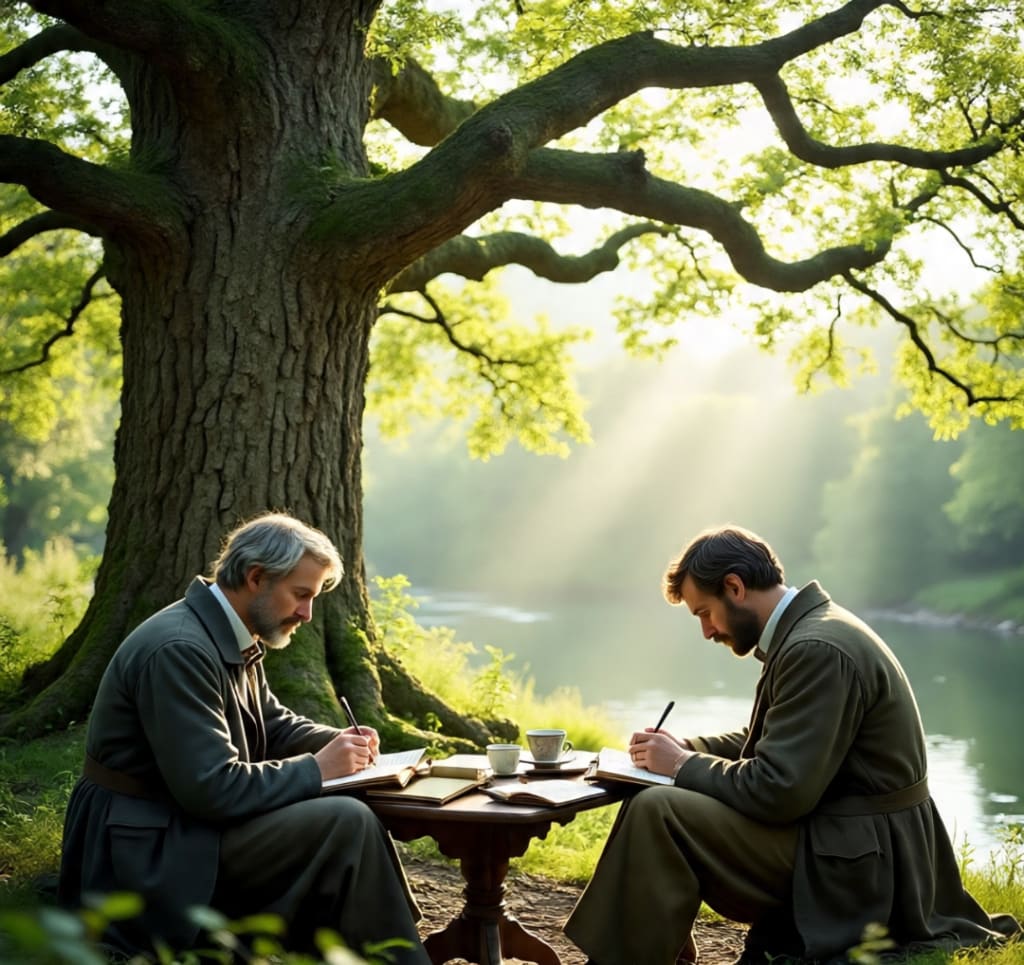 In the corner of a quiet town named Raeymoor, there stood an ancient oak tree known simply as The Whispering Shade. People said the wind that passed through its leaves carried forgotten poems. Beneath this tree met a small group of poets—men who spoke very little but whose thoughts soared beyond the skies. They called themselves The Brotherhood of Silent Verses.