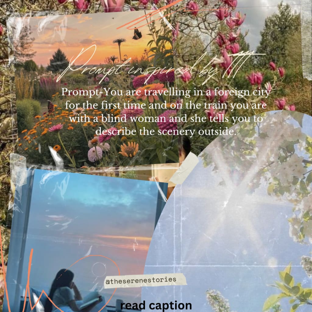 Prompt- You are travelling in a foreign city for the first time and on the train you are with a blind woman and she tells you to describe the scenery outside.