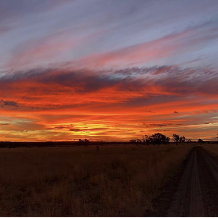 The outback sky is alive with pink, orange, green, blue and yellow;