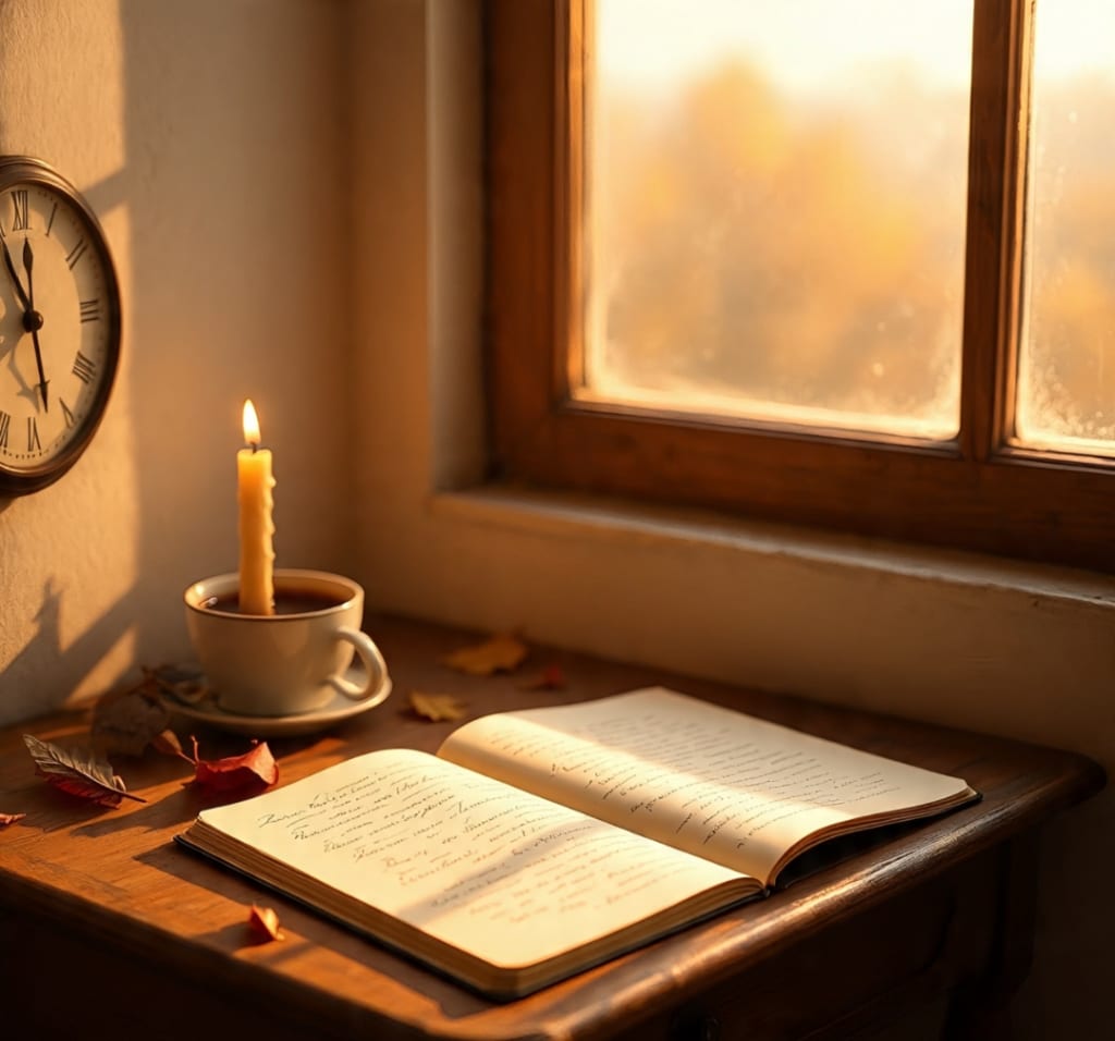 He looked around the space—the familiar desk, smooth with years of use; the clock ticking gently on the wall; the bookshelf heavy with poems, letters, and musings of those who came before. A soft breeze nudged a few amber leaves onto the floor through the slightly open window.