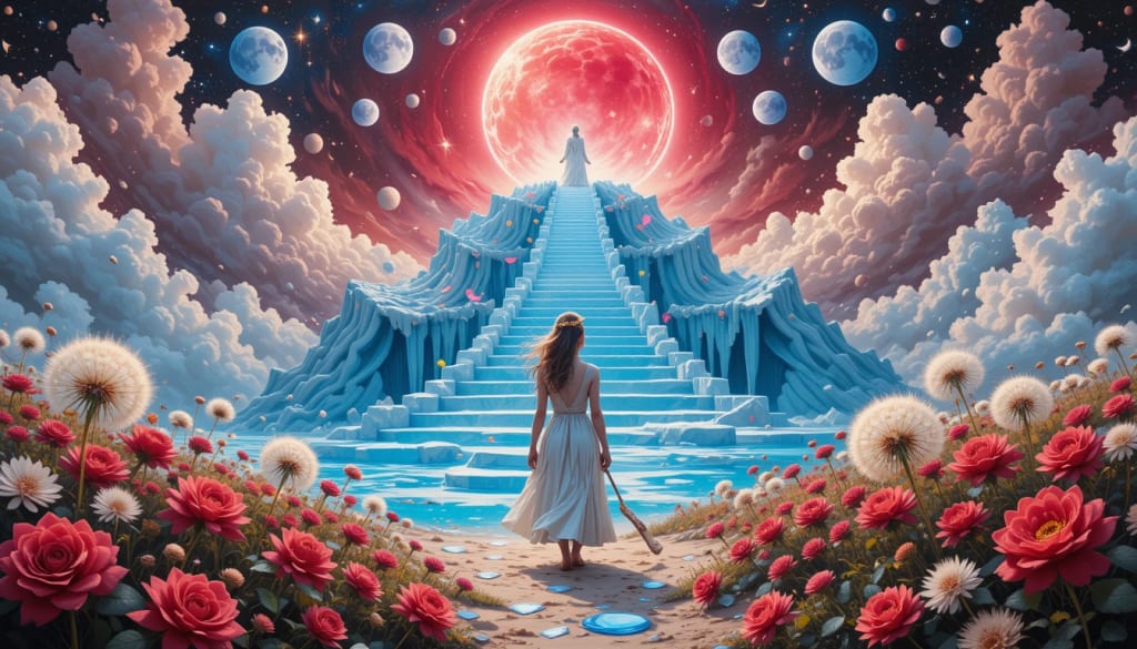 Day Seven: The staircase to the icy palace was steep, each step a memory I’d buried—a fight with my brother over nothing, a love I let slip, a promise to myself I broke. I carried the satchel, now light, and a bouquet of roses, their petals soft as forgiveness, their thorns sharp as truth. The Moonkeeper took them, her fingers cold, her eyes warm. “The moons are whole,” she said, pointing to a sky of glowing orbs, no longer shattered. “You’ve carved yourself into them.” My chest bloomed with starlight, my heart a constellation of thorns and petals. I woke on my bed, the air plain, but my hands glittered with pollen, my eyes still spinning.