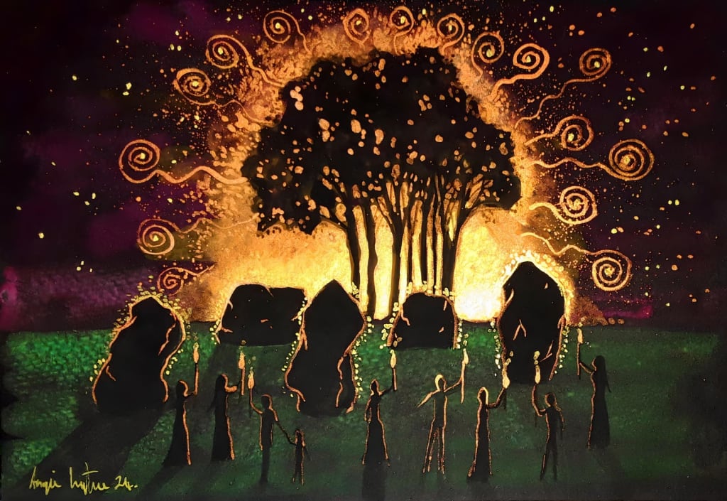 I love this painting with the earthlight shining through the trees as the faithful hold their torches, lighting the stones.