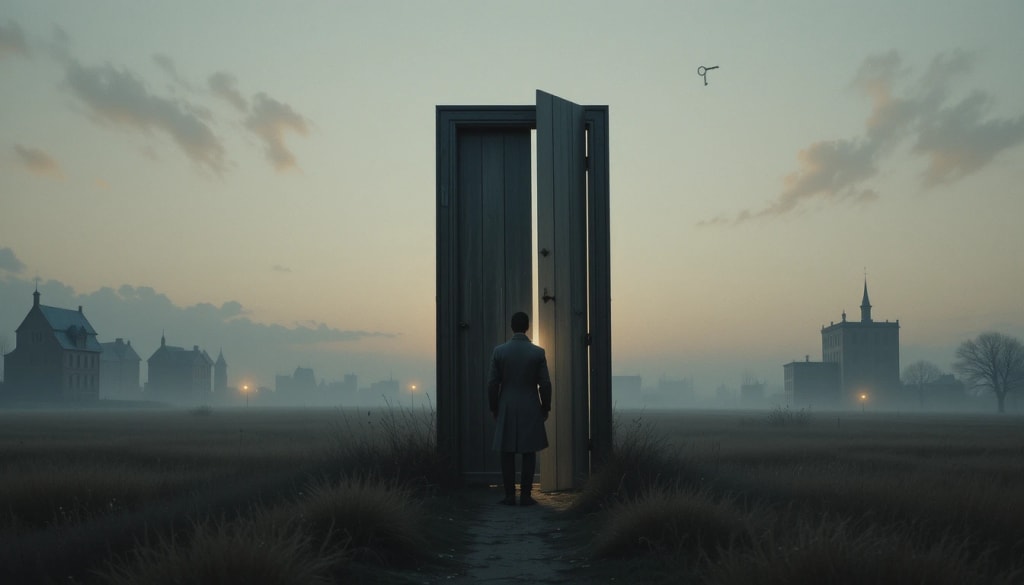 A lone door, weathered but waiting.