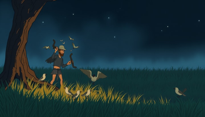 He sings to the birds in the soft moonlight.