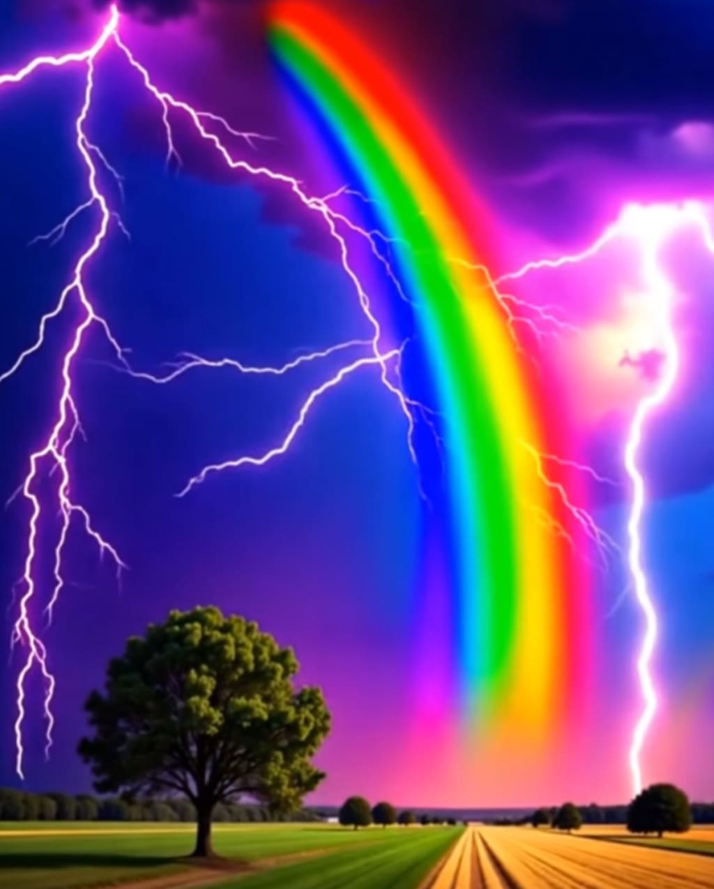 You know that this really can occur. I have seen a rainbow on one side of the sky and the black sky of a storm approaching on the other side. Good job.
