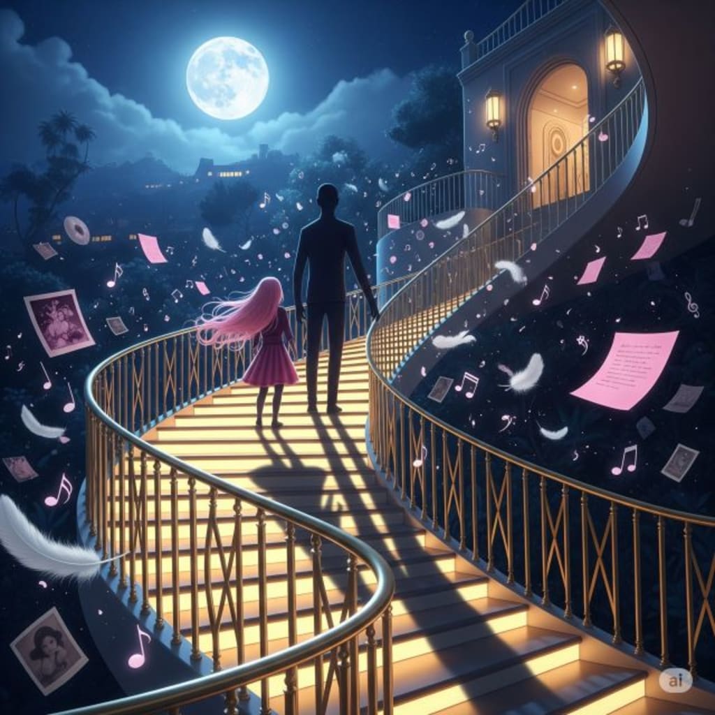 The spiral staircase behind him pulsed silver-black, railing gleaming like a warning.