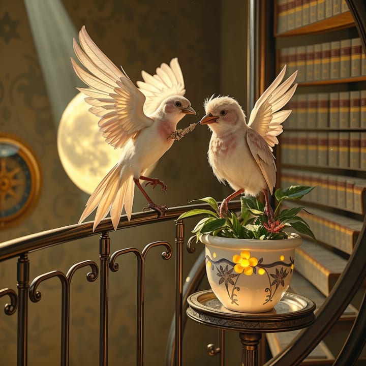 One held a ledger. One held a feather. One held Sweetie Bird, who chirped in glyphs.